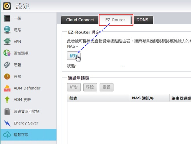 在「輕鬆存取」的畫面上有「Cloud Connect」、「EZ-Router」、「DDNS」三個分頁畫面,其間並不是單存的運作,是有連結互動的關係,當然這些互動與你的網路架構息息相關,Cloud Connect應該算是存取端的服務,想要自動選擇「EZ-Router」,手動則選擇DDNS。先來試試啟動「EZ-Router」。