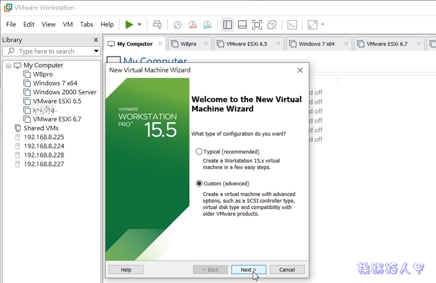 啟動 VMWare Workstation 15,選擇「Create a New Virtual Machine」來建立虛擬機器,不過我習慣使用功能表方式來運作,選擇【File】→【New Virtual Machine…】,出現精靈畫面選擇「Custom(advense)」並點選〔Next〕按鈕。
