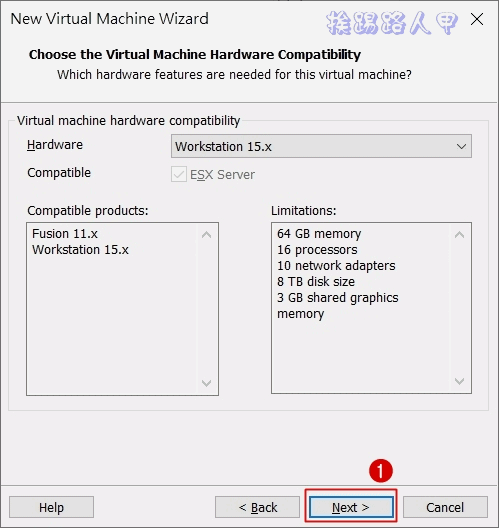 出現虛擬機器的硬體相容性版本選擇,直接按下〔Next〕後,選擇「I will install the operationg system later」。