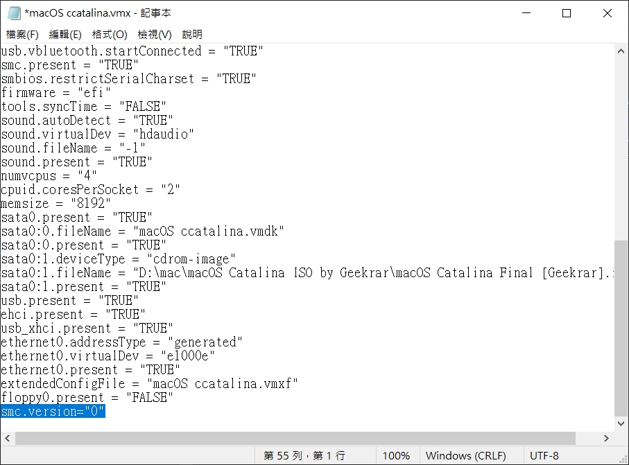 開啟後滑到最後一行,補上「smc.version=”0″」,使用 Ctrl + S 快速鍵來儲存。
