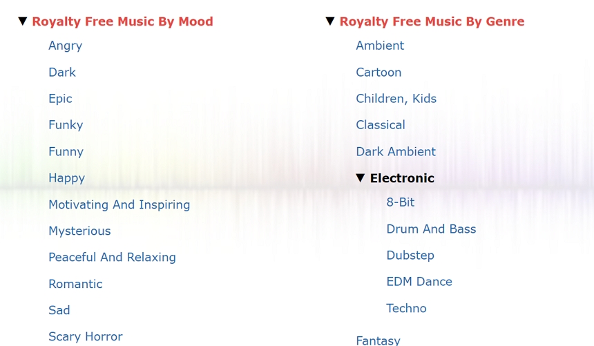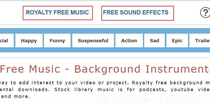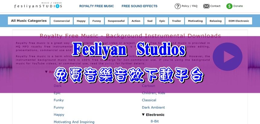 首先進入Fesliyan Studios網頁(文末有網址),可以在網頁上方看見音樂與音效分類。