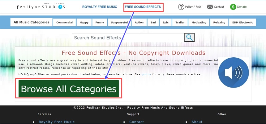 在首頁點〔FREE SOUND EFFECTS〕後,點〔Browse ALL Categories〕即可進入音效部分。