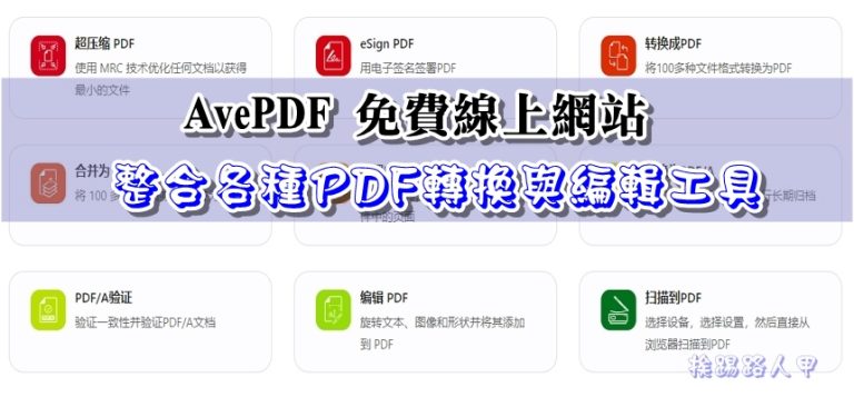 PDF檔案具有跨平台與容易攜帶的優點,因開放性標準,用PDF格式無所不在,一般瀏覽器都具備有開啟PDF的能力。所以特別介紹一套線上 AvePDF 免費 PDF 轉檔與編輯工具,可輕鬆將PDF格式互轉,也可eSign PDF(電子簽名)、合併、壓縮、添加與掃描等多種工具,重點是免費的。