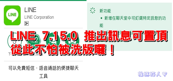 LINE在功能上不斷的加強與改進,之前超實用的「爬梯子」與「話題投稿」功能筆者相當喜歡,如今又推出聊天室可設「置頂公告」功能,從此訊息可以不怕被洗版,目前新版本先在Android平台上線,iOS平台可能要稍等一下囉!