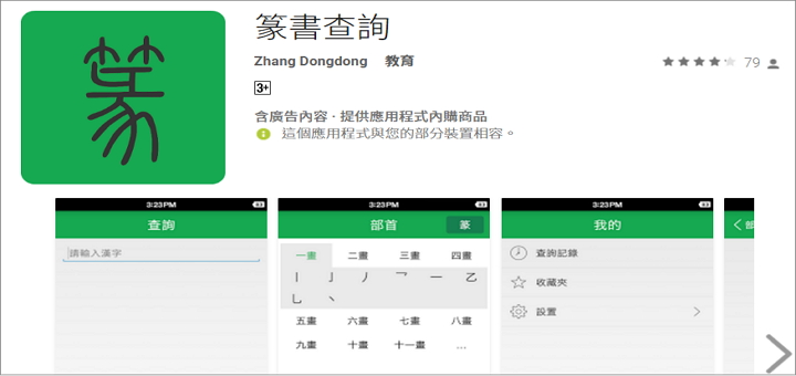 篆體字運筆力度均勻線條粗細劃一,字體簡約修長,為書法家們所喜愛,一般印章上常使用篆體字來雕刻,網路上也許多的線上篆書查詢字典,不過總比上行動裝置的方便,「 篆書查詢 」是一套篆書體查詢的App,想要查詢篆體字輕輕鬆鬆,可說是篆書/篆刻愛好者的好幫手。