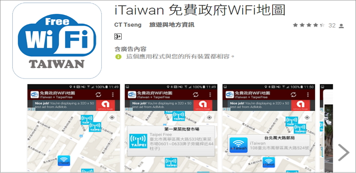 各大電信吃到飽的方案越來越少又貴,流量式租約將來會是常態,因此善用WiFi才是根本之道,中華電信有些方案的熱點是免費的,所以善用WiFi把用量控制在租約流量下以節省費用,其實 iTaiwan 的WiFi是免費的,可惜沒有7-11那麼好找與分布,這時「iTaiwan 免費政府WiFi地圖」絕對是你的好幫手。