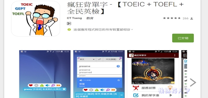 隨時背TOEIC+TOEFL+全民英檢單字的「瘋狂背單字」App itwalker2016/07/13Android 軟體Google翻譯也是許多人的最愛,當然,每套軟體都有其優缺點,反正工具就是幫人解決問題的所在,功能強是唯一的選擇嗎?如今手機相當普及,筆者要介紹一套專利用手機背單字 瘋狂背單字 App,在手機螢幕上彈出式單字卡的方式,不打擾您使用手機的情況下,也能英語學習不中斷。