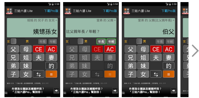 每次到了過年節日,親戚團聚在一起,總是會寒暄關心一下,不過有時親戚一多,不常見面,還真的一時叫不出親戚的稱呼遇到類似的窘境層出不窮,挨踢路人甲告訴你,有一款「 三姑六婆 - 親戚稱呼計算機」app,以計算機的操作方式輸入親戚關係,讓您快速查詢親戚的稱呼,真的非常方便又有趣。