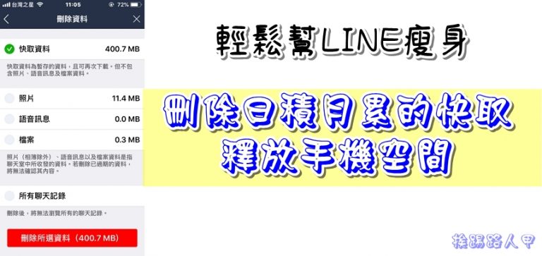 是否因為空間不足而導速度變慢呢?隨著 LINE 的使用率提高,大大小小的訊息、照片、影片樣樣來傳送,然而日積月累的才發現剩餘容量一直退減,導致手機容量不足,因此適時的清除快取上的資料除了可以瘦身也可讓手機運作順暢些。
