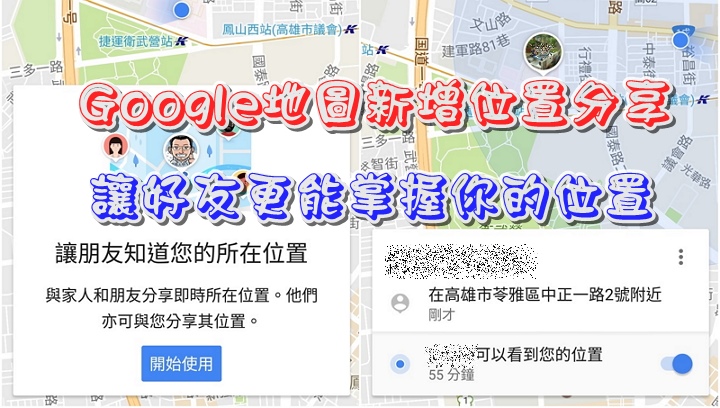 最近Google地圖推出定位分享服務新功能,就是可以即時互相追蹤位置,其實不往隱私而正面思考的話,尤其是辦活動、外出有小朋友時都相當實用,且不只一對一的分享位置,也可以針對多人分享位置,甚至可以指定分享的時間長短,以確保個人的隱私。