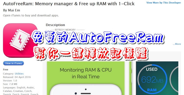 覺得iPhone/iPad越跑越慢嗎?免費AutoFreeRam幫你一鍵釋放記憶體 itwalker2016/10/14iOS軟體用了一陣子都會發現速度一直往下掉,總是感覺機器越來越使不上力,假如是空間不足而導速度變慢,iMyfone Space Saver for iOS能調節空間的工具,讓系統有足夠的空間以提升效能。至於記憶體上的程式釋放,就要靠免費的「AutoFreeRam」幫你一鍵釋放記憶體,解決卡頓系統讓系統運行在最佳狀態。