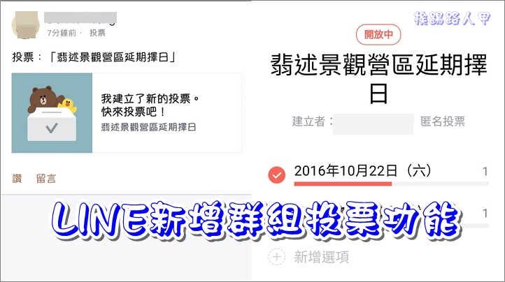 LINE新增群組「投票」功能 ,讓多人直接票選簡單又實用 itwalker2016/10/21Android 軟體, iOS軟體雖然LINE最為詬病的是聊天記錄的保留問題(iOS版已支援備份到 iCloud Drive),但似乎不影響使用者的熱愛,最近LINE新增「群組投票」的功能,可以在群組上設定投票的項目與結束時間(例如聚會地點、時間…等),這樣可以了解參與者的意見,尤其是群組人數眾多時才不會人多口雜,直接票選簡單又實用。