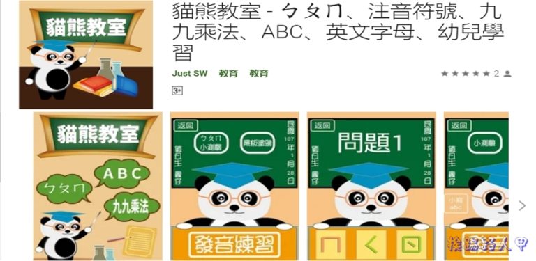 由於手機的普及,一款為歲學齡前孩童設計的 熊貓教室 ,藉著可愛的貓熊卡通,來帶領小寶貝們進入學習的殿堂,貓熊教室裡有注音符號、九九乘法、英文字母ABC三種教學內容,且都有發音練習、小測驗與黑板塗鴉等方式學習,讓小孩隨時隨地都可以自我學習。