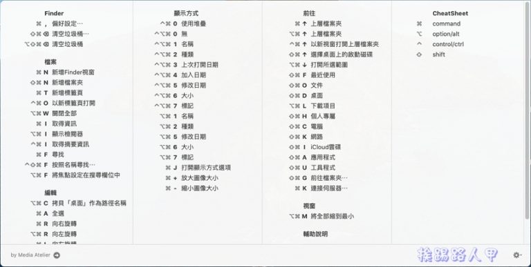 Macbook Air軌跡觸控板太好用了,真的回不去Windows筆電,不過想要完全拋開滑鼠的束縛,熟悉MAC OS快捷鍵應用才會事半功倍,來看看 CheatSheet 補助小工具,長按「蘋果鍵」就能快速帶出快捷鍵列表視窗,讓你邊用邊學習使用快速鍵組合。
