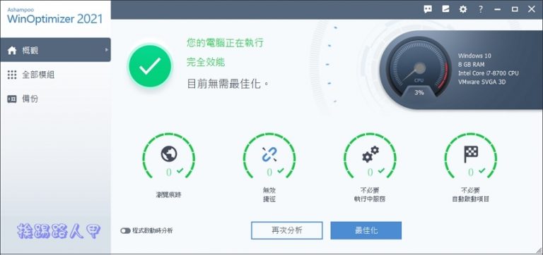 系統經年累月形成的負擔是事實,更換機器設備與重灌系統是一帖良藥,不過殺雞不一定要用牛刀,網路上頗受好評的系統優化軟體 Ashampoo WinOptimizer 2021 推出限時免費下載的無限完整版,可以先幫你把把脈與診斷,直接清除系統暫存檔、登陸檔與垃圾軟體,以保持系統有更順暢的速度。