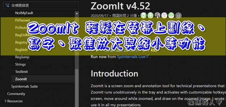 簡報時要讓台下的聽眾尋找你小小的滑鼠指標,有如大海撈針般的窘境,介紹一套 Zoomlt 小工具,輕鬆將螢幕上劃線、寫字、標註、放大與縮小,讓你任何環境下,都可以擁有類似PowerPoint的畫筆功能,螢幕也可以隨時將聚焦的畫面縮放。