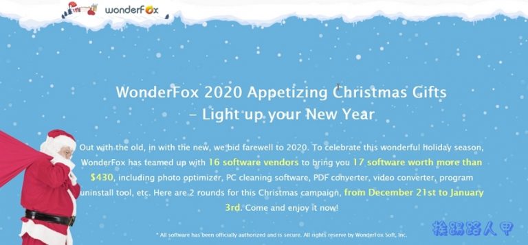 叮叮當,叮叮當,鈴兒響叮當……聖誕節的鐘聲已經敲響,為了回饋廣大用戶,WonderFox 2020與16家知名軟體公司舉行2020年耶誕節限免活動,17套軟體總價值超過430美元。活動將從2020年12月21日開始,分為2輪進行,趕緊加入這場 WonderFox 耶誕節活動大派對吧!
