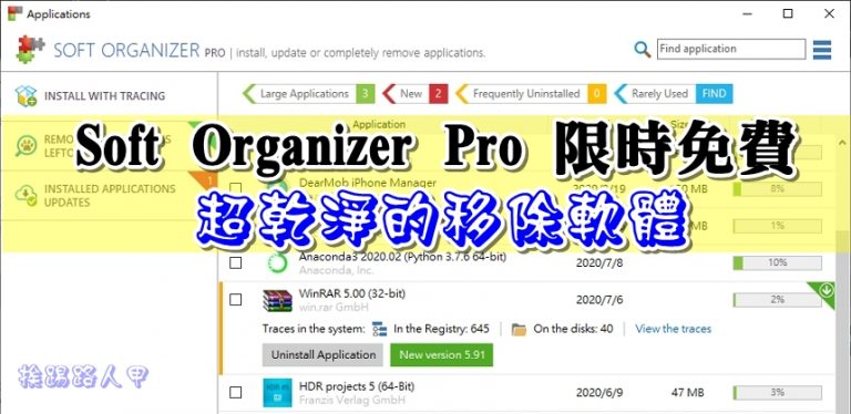 有些程式設計師不依Windows API來設計,造成用戶很難移除,即使不喜歡也無可奈何要繼續保留在系統中,介紹一套 Soft Organizer Pro 超乾淨移的除軟體,會深度剷除該軟體所遺留在電腦中的垃圾,以保持系統有更順暢的速度,目前限時免費下載喔!