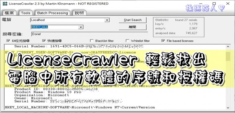 每次重灌電腦系統時,大部分人都已遺忘了使用的序號,甚至找不到購買的資訊,怎麼辦?挨踢路人甲告訴你使用 LicenseCrawler 這個工具,輕鬆地揪出系統上的各個軟體序號,除了免費外,不用打什麼指令,只要一鍵等待掃描即可讓所有安裝過的軟體序號現形。