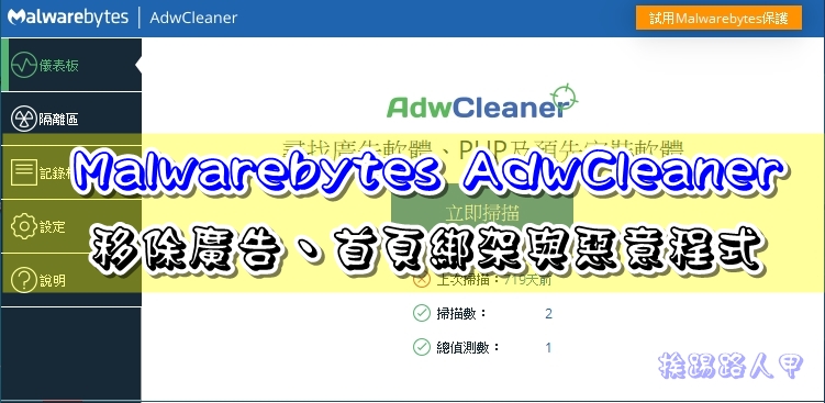 瀏覽器遭惡意程式綁架的狀況層出不窮,連MIS人員也防不勝防, Malwarebytes AdwCleaner 是一套可移除惡意軟體移除工具,避免妳不小心開啟了惡意網站、首頁被綁架,甚至下載了惡意檔案造成電腦變慢,重點免費簡單易用且不需要安裝,支援中文,趕快來試試看,立即還你一台乾淨的電腦。
