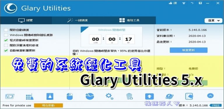 介紹一套 Glary Utilities 5.x 實用系統優化工具箱,能輕鬆幫你把脈與診斷,不管清除垃圾檔案、登錄檔除錯、重複檔案偵測、清除暫存快取等功能眾多且實用,隨時讓你的系統保持更順暢的速度,老實說,用過後回不去其他優化工具了,來試試這個實用的系統優化工具。