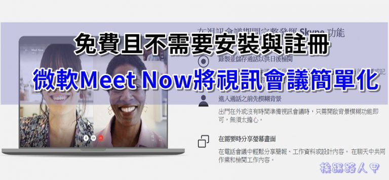 現階段與其爭論 Zoom 是否安全,不如嚐試其他視訊軟體,之前使用過Skype通訊軟體與Zoom,正在覓尋其他視訊工具時,微軟另開闢了一個「 Meet Now 」服務,其實就是不用安裝軟體、不用註冊的Skype 連結方式,個人覺得還蠻實用的,重點是免費的啦!