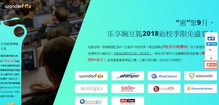 暑假結束開學了,WonderFox於2018推出返校限免活動,豌豆狐聯合9家知名軟體商,為大家提供了大量限免禮物及大幅折扣,每位用戶都可以免費獲取限免軟體(總價值350+美元),並有機會獲得神秘大禮(9月3日至9月17日共15天),心動嗎?趕緊加入這場返校限免活動大派對吧!