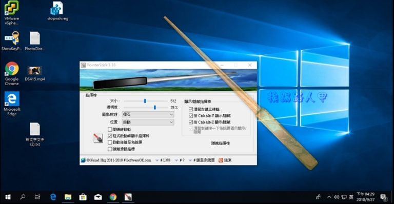 有時還是會有沒帶簡報用的指向裝置,或許還有小小的滑鼠指標可以加減用,但要讓台下的聽眾尋找你小小的滑鼠指標,有如大海撈針般的窘境。介紹一套 PointerStick 小工具,輕鬆將滑鼠游標變成超大、超顯眼的巨大指揮棒,在簡報或教學上可說是超級指揮棒。