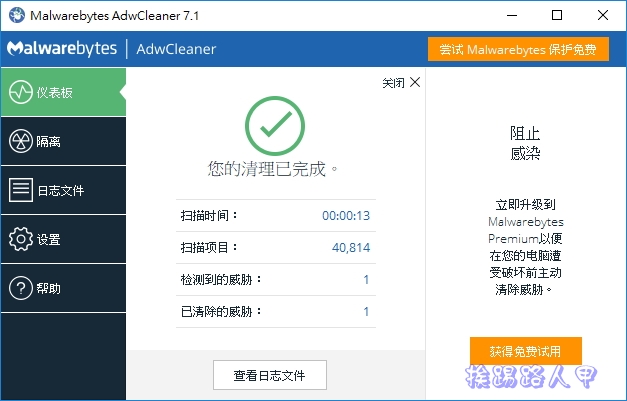 瀏覽器遭惡意程式綁架的狀況層出不窮,連MIS人員也防不勝防,AdwCleaner是一套可移除惡意軟體移除工具,避免妳不小心開啟了惡意網站、首頁被綁架,甚至下載了惡意檔案造成電腦變慢,免費 AdwCleaner 不需要安裝就能幫你移除常見的惡意程式與工具列,如今也支援中文介面真的很方便哦!