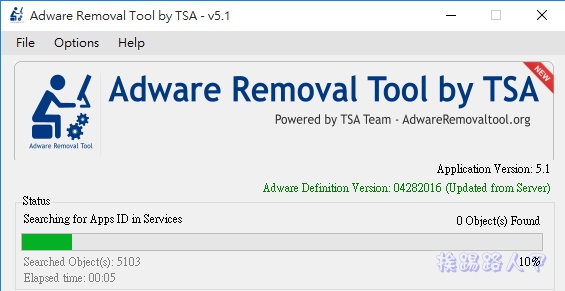 越來越多的免費軟體,在安裝中安插了各種廣告程式或工具列等推廣軟體,瀏覽器遭惡意程式綁架的狀況層出不窮,Adware Removal Tool by TSA 是一套可移除廣告軟體、工具列的免費小工具,支援目前Internet Explorer、Google Chrome 和 Firefox 瀏覽器,輕輕鬆鬆的點選執行,即可掃描偵測並移除常見的廣告程式、工具列。