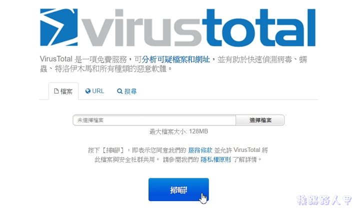 想要百分百的防護是不容易的,挨踢路人甲認為良好的使用習慣也是相當重要的,像我目前老舊的筆電是不安裝防毒軟體的,因為實在無法忍受世上防毒軟體的效率,因此習慣了雲端掃毒工具,既不用安裝又不佔空間,更不用更新病毒碼,所以介紹這套 VirusTotal 的免費免費雲端掃毒工具。