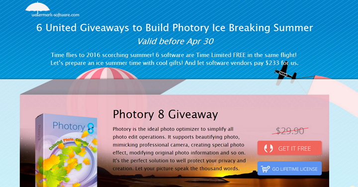 這夏天即將來臨的時刻,Watermark-Software 公司針對初夏推出限免活動,即日起至 4/30 止,Photory 8(相片特效與編輯軟體) 、Ashampoo WinOptimizer 11(系統優化工具) 、SodaPDF 8(PDF工具) 、PhotoToFilm 3.4(相片轉為影片工具)、EaseUS Todo PCTrans Pro(資料轉移工具)與Genie Timeline Home 2015(檔案轉檔), 總計233美元通通送給你。