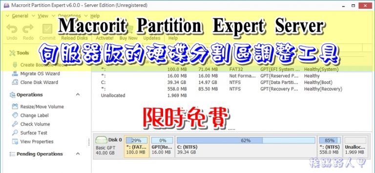 常常DIY電腦安裝系統,因此需要分割區調整工具,這裡介紹一套 Macrorit Partition Expert Server 硬碟分割區調整工具,可以輕鬆的分割、合併或格式化儲存裝置,且也支援Windows 10/11系統與Windows Server版,重點目前限時免費的,你不下載來試試嗎?
