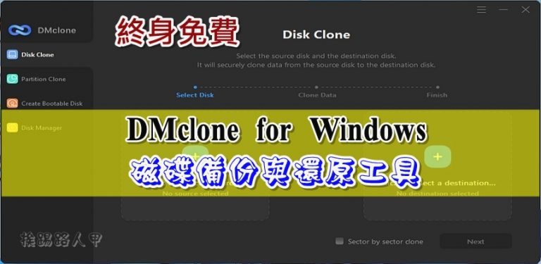 DMclone for Windows是一款磁碟備份、還原和複製的工具軟體,支援Windows XP/7/8/8.1/10/11等32位元與64位元的作業系統,可在Windows視窗環境下直接運作,不論操作的方便性與軟體功能,都相當實用,目前限時終身免費序號,想要備份和還原你的系統,千萬別錯過喔!