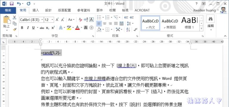 筆者用的Excel機會比Word多,不過偶而也會用word,有時想要在「所見即所得」的Word排版看結果,通常都會餵一些資料,最常用的就是尋找一篇文章來複製貼上,其實不用那麼麻煩,原來Word裡面也有個 rand 函數,可以快速產生虛擬文章,方便你排版測試,太實用了。