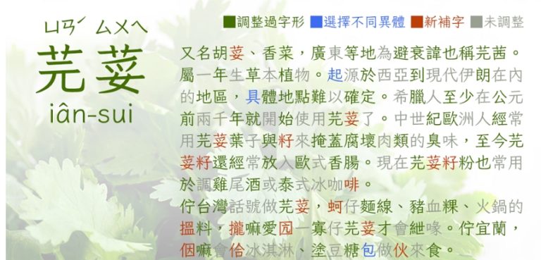 「 注音芫荽 」是芫荽字型的注音版,就是會在中文字右側標示注音符號,想要在文字旁上需要需要顯示注音的文章或製作兒童學習教材相當好用。此字體主要以注音IVS字型規格製作之開源自由中文字型,且補充了一些原來收有漢字但缺少讀音之文字的讀音,重點可免費安裝到電腦使用。