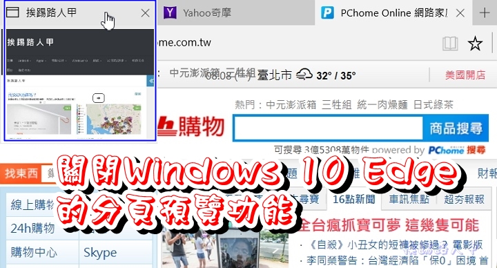 到目前為止,Microsoft Edge仍然逃不過冷板凳的命運,幾乎只是要下載Chrome的替代工具,感覺有點悲哀,不過Edge的速度真不錯,但對於分頁預覽功能不習慣,於是DIY一下將Edge瀏覽器的分頁(TAB)預覽功能關閉了。