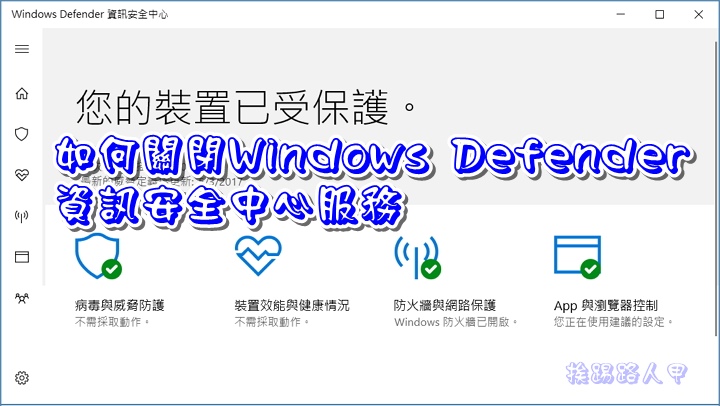 新版的Windows Defender功能不只防毒保護,其實就是資訊安全中心的整合介面,記得之前已分享過關閉Windows 10的 Windows Defender的即時保護,但更新版本後如何關閉Defender安全中心呢?來看看挨踢路人甲的小技巧吧!