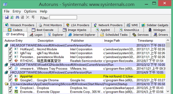 找出隨Windows開機而自動啟動的程式- Autoruns for Windows itwalker2017/01/27Windows10, Windows8很多的軟體都會隨著Windows開機而自動執行,設計好點的軟體會提供要不要隨開機程式而啟用的功能,但怕的是一些不說明或惡意程式隱藏在自動啟動中,因此只要系統安裝過多的軟體常常造成開機過慢的窘境,那可以試試 Autoruns 幫你免費找出隨開機自動執行的程式。