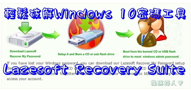 輕鬆破解Windows 7/8/10密碼工具-Lazesoft Recovery Suite itwalker2015/08/14Windows10, Windows8, 電腦技術眾所周知,Windows 10有了嶄新的操作介面,對於帳號與密碼也有不少的改變,假如你真的忘記了本機帳戶的密碼,或許你可以參考「忘記了Widnows 10密碼怎麼辦」文章,若你不想那麼麻煩,挨踢路人甲告訴你一套「Lazesoft Recovery Suite 」工具程式,不需要艱深的技術,只要滑鼠動一動即可重設密碼。