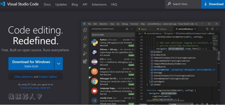 為了讓眾人的文書筆電也能輕鬆撰寫Python、Java、PHP、HTML等, Visual Studio Code (簡稱VSCode)是一個支援多平台的開放原始碼免費程式碼編輯器,由微軟開發,並支持Windows,Mac OS,Linux,只要裝上對應語言的延伸外掛模組(Extensions),即可輕鬆變成IDE的開發環境。