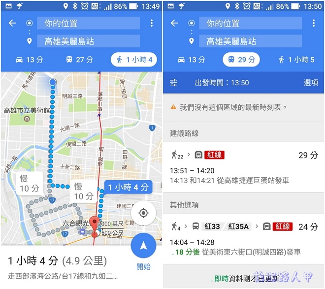 不管是PC或手機,Google地圖都相當受到歡迎,可以查詢地圖位址、住址、街景、路況、天氣、大眾運輸、衛星空照圖與導航,之前推出手機版App新增停靠點,支援多點路線規劃外,如今又加入了即時大眾運輸資訊,讓你規劃路線能有公車、火車、捷運出發與到站時間,輕鬆掌握搭車的時間。