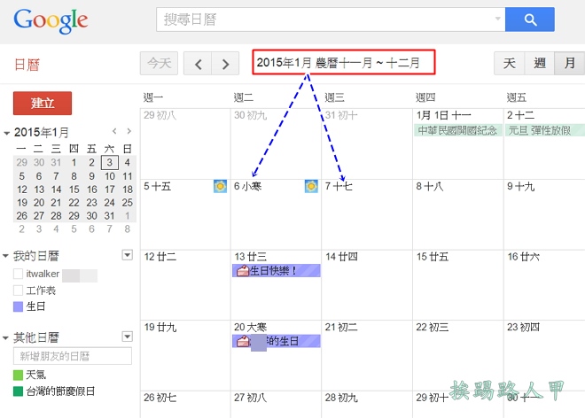 你的Google行事曆新增台灣節慶假日與農曆節氣資訊了嗎? itwalker2015/12/29軟體, 雲端服務只要有一個帳號就能將聯絡人、行事曆帶著跑,且還能有台灣節慶假日、農歷、節氣與天氣等資訊,當然這些資訊就是要讓電腦、手機與網站全部同步更新與顯示,當然非Google的帳號莫屬。