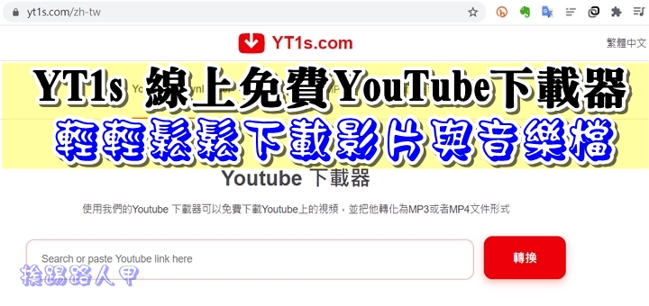 下載 YouTube的影音檔方法不少,最常見的是安裝瀏覽器的外掛套件,但套件越來越多,慢慢的拖垮了瀏覽網頁的效能,所以找個雲端的轉換服務,不須安裝任何擴充套件或軟體,使用 YT1s 的雲端服務,輕輕鬆鬆下載轉換影片與音樂檔,速度快易操作且沒有廣告喔!。
