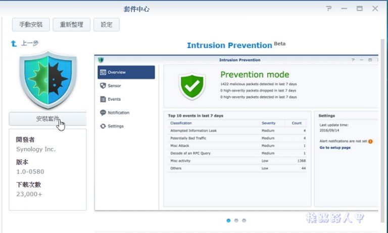 講到網路安全,配備防火牆產品就已足夠了嗎?或許專家會告訴你,防火牆與防毒系統僅是網路基本的防護措施而已,Synology RT2600ac /RT1900ac無線路由器提供了Intrusion Prevention套件,入侵偵測與入侵防禦一次到位,讓你的網路更安全。