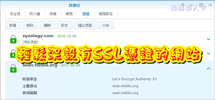 自從購入Synology NAS後,除了基本的NAS儲存服務外,透過外掛套件的擴充,不管BT、Web網站、電子郵件、FTP、私有雲、印表機伺服器都輕鬆加設,其實只要你有一台Synology NAS,就已經具備了架站的基本環境,讓挨踢路人甲來告訴你,使用NAS架設 SSL 憑證的網站是多麼輕鬆的事。
