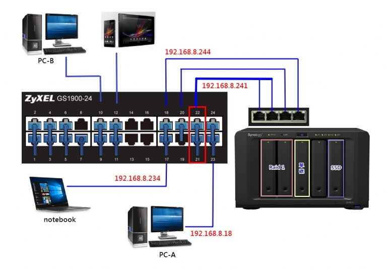 儲存空間似乎是NAS的代名詞,殊不知再大的空間也得靠網路來傳送,也許你會發現目前的NAS具備兩埠網路以上的機種越來越多,因為不管你硬碟配置怎樣的RAID,甚至使用SSD,加上再快的CPU都得屈就於網路的瓶頸,所以今天又來談談 Synology DS1517+ NAS 的 Link Aggregation 網路連接配置。