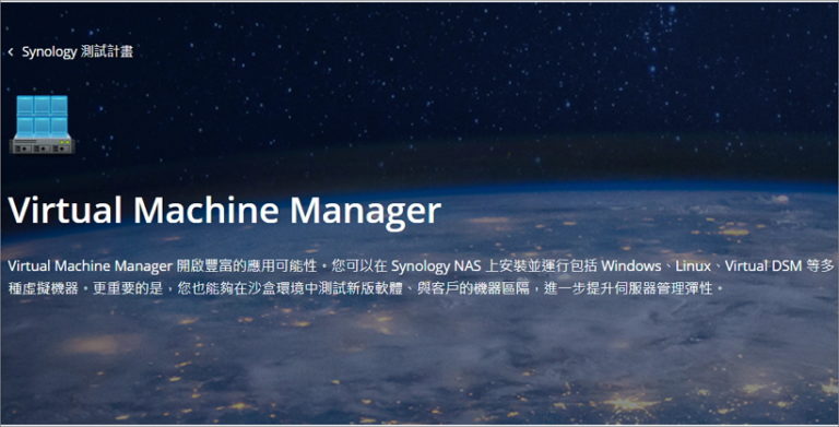 挨踢路人甲都使用VMware來玩Widnows與Linux虛擬系統,不過最近發現NAS也慢慢跳脫儲存的範疇,功能包羅萬象,如今也向虛擬機器靠攏,Synology NAS的 Virtual Machine Manager 已經來到了beta 2,挨踢路人甲迫不及待的像要來玩一玩。