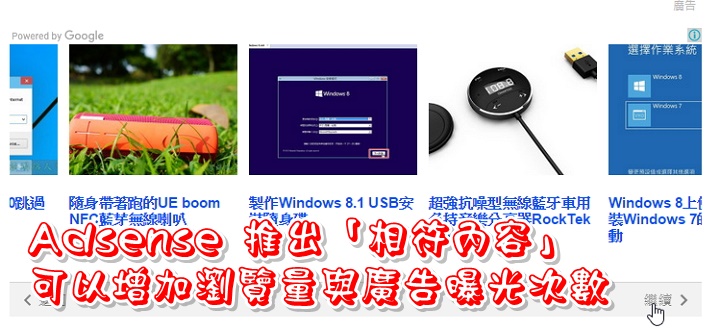 Google Adsense推出一項免費的「相符內容」推薦功能,就是向網站訪客宣傳文章的功能,讓讀者輕鬆找到想要的興趣內容,透過相關內容的顯示,有機會讓訪客在網站上逗留更長的時間,這樣瀏覽量會增加,廣告曝光次數也會隨之增加,相對的廣告收益也會連帶攀升