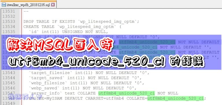 租個虛擬主機架設 Wordpress 真的一點都不難,挨踢路人甲使用最傳統的方式來匯出資料,因為較方便匯入另一台備援網站上,不過卻發生了"utf8mb4_unicode_520_ci" 的錯誤,原來是MySQL的不同版本造成的,只要自己稍微DIY加工後就可匯入囉!